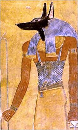 in de gedaante van een jakhals of als mens met een jakhalzenkop. Hij was ook de god van het